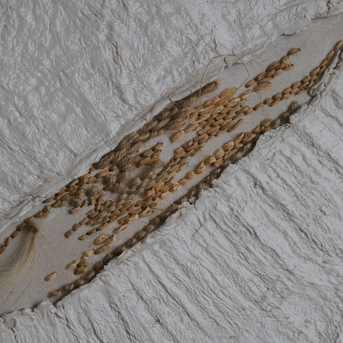 Esparto grass, jute rope, organic raffia, paper raffia and clay on organic linen canvas